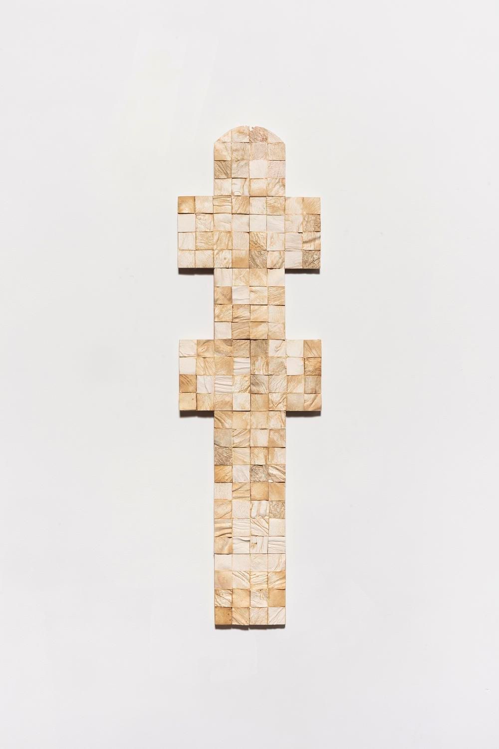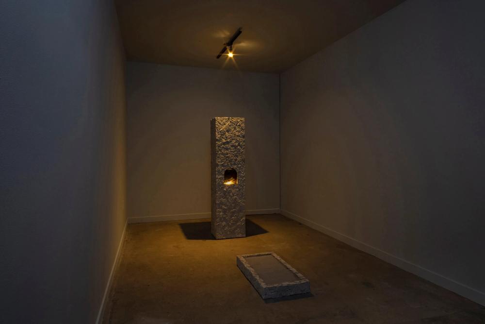 The exhibition ends with a single sculpture: a “peto de ánimas.” In Aparicio’s native Spain, these “shrines to souls” are traditionally made of stone and contain relics from religious icons to ferry prayers of salvation. Aparicio instead centers the placenta of her son protected by the cement tiles imprinted with cadaver skin that have become a defining element in her creative work. Adorned with the words “si buscas milagros mira aquí,” or, “if you are looking for miracles look here,” inspired by Galician petos, the piece commemorates her own tumultuous experiences with motherhood while highlighting the liminality of baby’s first blanket and how quickly its lifesustaining abilities are cast aside amidst the triumph of a successful birth. Like cemetery flowers, the placenta captures the essence of life only by facing its own death.