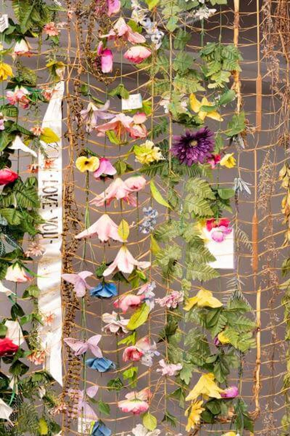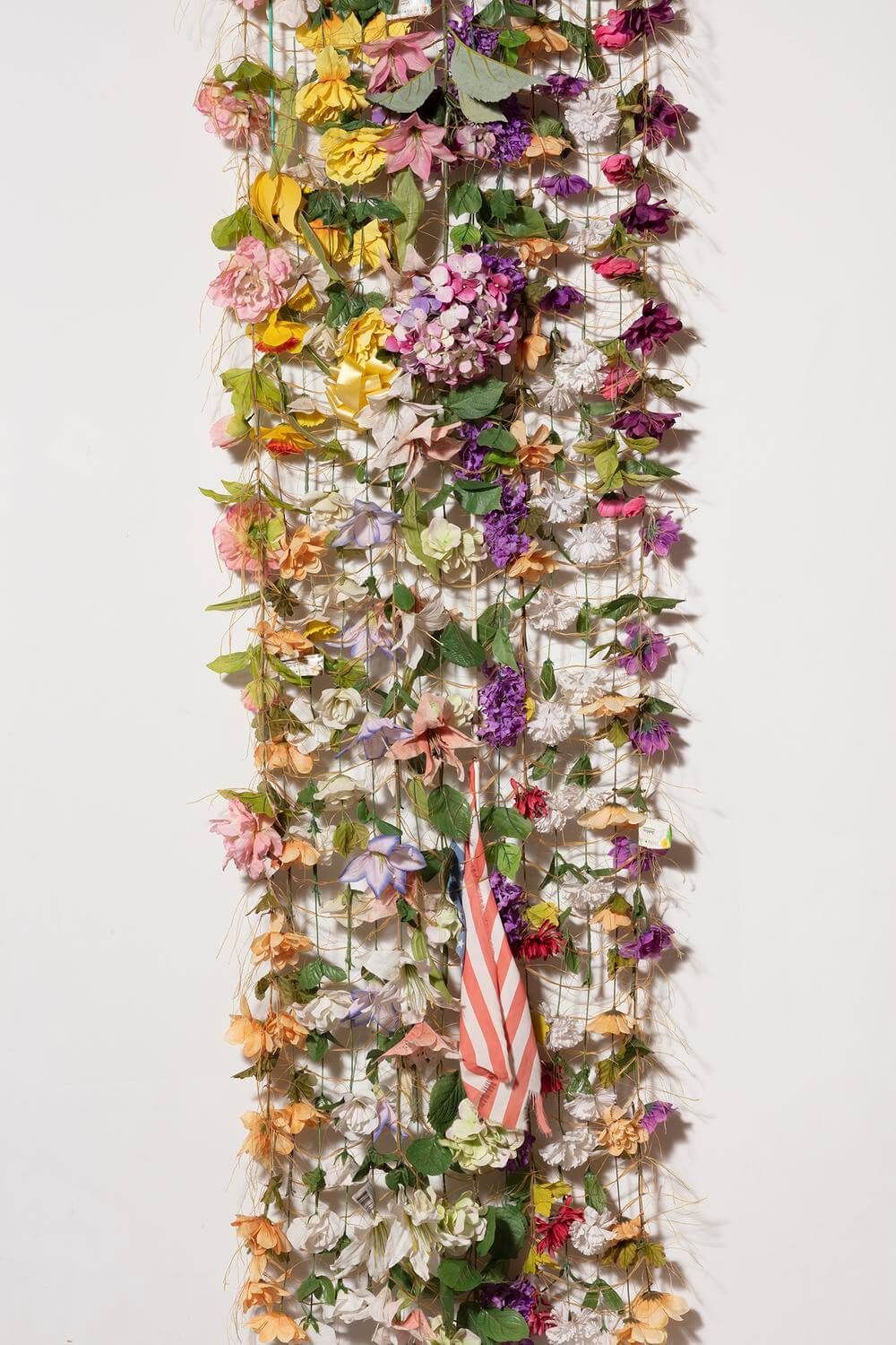 Coda invites viewers to consider the durability of memory and its ability to evolve in concert with its surroundings. The exhibition begins with a 48 foot long tapestry woven with flowers that the artist collected from the garbage of cemeteries. Once-intimate tributes gathered with care and imbued with the love, grief, and reverence of their curators fade into anonymity— embodiments of the very fragility that necessitated their gathering. The pinwheels, balloons, and other nonorganic tokens dotted throughout amplify these inextricable messages of mourning and celebration that together resonate more deeply than could any one piece alone. Like the notes of a great coda, these tributes rise, fade, and blend together to bring closure to a sweeping movement of moments. I miss you. Happy birthday, Mom. Forever in our hearts.