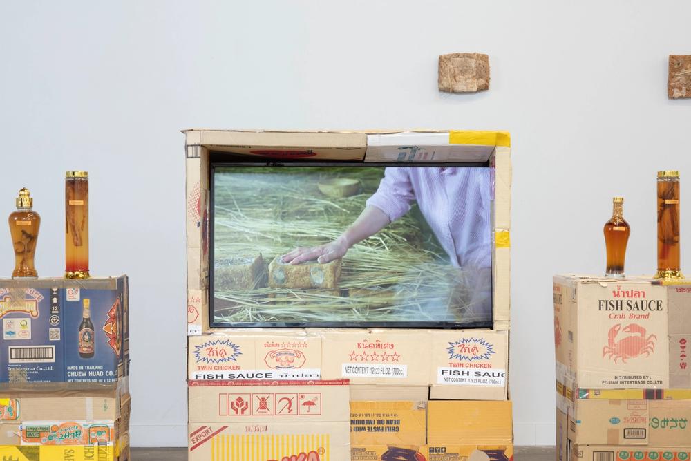 Meju (메주) is a brick of fermented soybeans that, although not eaten on its own, is a staple in Korean cuisine used as the basis of several condiments such as doenjang (soybean paste), ganjang (soy sauce) and gochujang (chili paste). Meju is made using an intricate traditional process dating back to the 1500s that involves inducing natural fungal fermentation for several months under controlled settings. The meju in this exhibition was handmade by the artist with materials embedded into the soybeans: bones, roots, shells, pages from The Savage Mind by Levi Strauss, and articles about Asian hate crimes printed on rice paper. These meju bricks, and the agricultural heritage they represent, belong to the realm of the Bride— soon to be stripped bare by the Bachelors of multinational franchise corporations and the accompanying patriarchy, white privilege, and cheap mass production. Ultimately, what once came from the Bride is diluted into a generic brown gravy and given a name that maps neatly onto the palate of the average Western consumer: Oriental Sauce. Although the word “Oriental” has fallen out of favor as a racial descriptor, the slew of Oriental food products in every grocery store in America are evidence of the unconstrained homogenization resulting from the global movement of capital, information, and population.